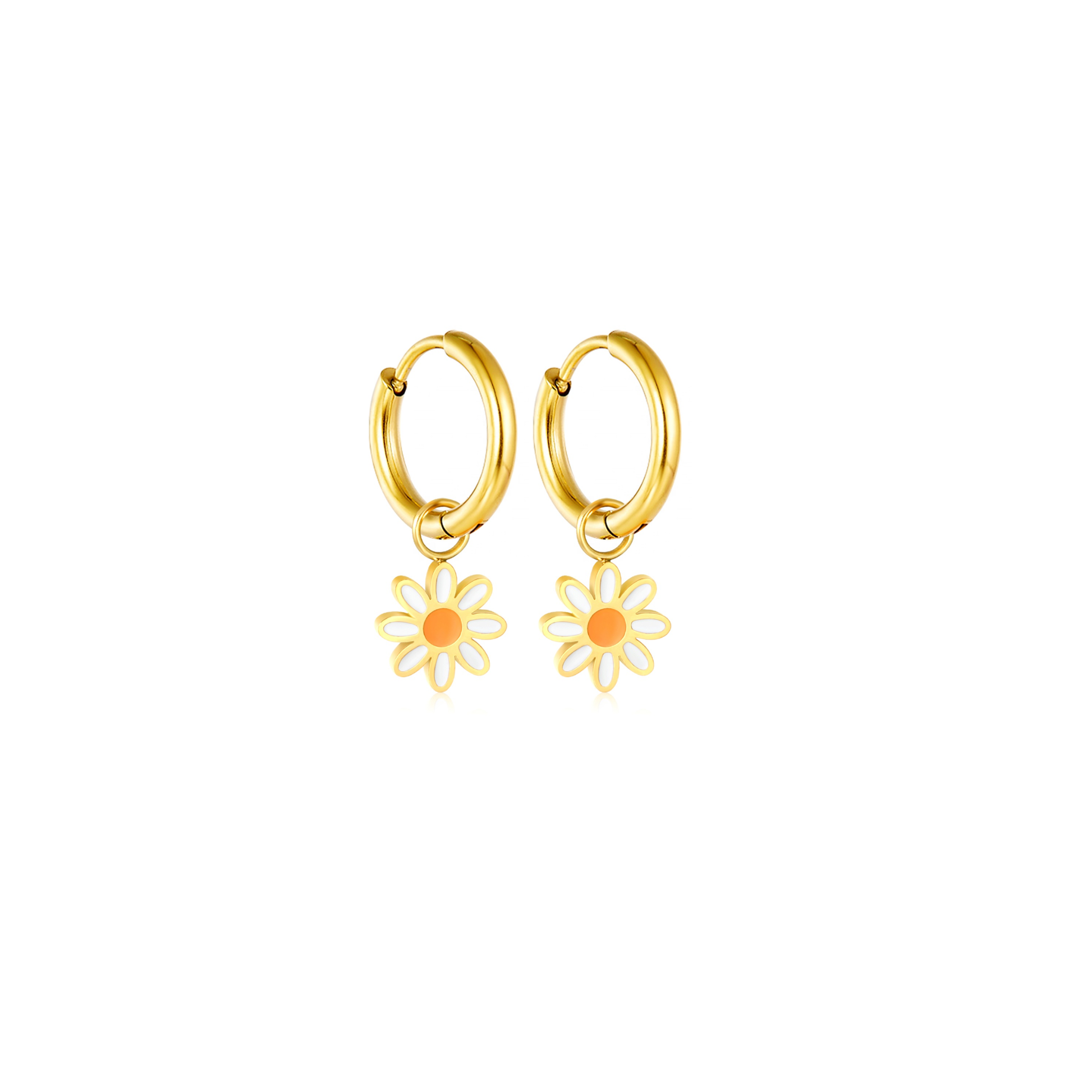 The Daisy Earrings by Kjayde are waterproof gold huggies featuring a petite daisy charm in glossy white enamel and soft yellow. Lightweight, beach-ready, and blooming with coastal joy.