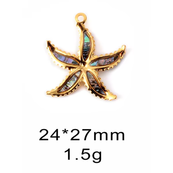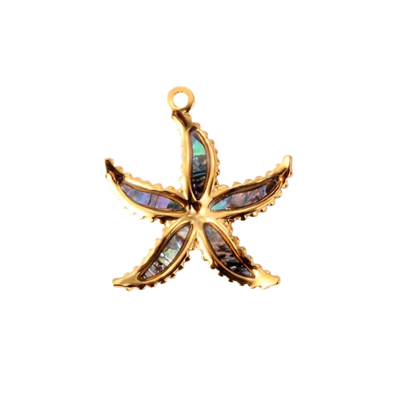 Etched in gold and inlaid with iridescent shell, this starfish charm glows like ocean water under moonlight — deep, mystical, ever shifting. Each arm is flecked with swirling hues of indigo, emerald, and stormy pearl, like a tidepool kissed by starlight.