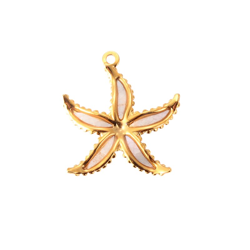 Delicately edged in gold with soft, pearlescent inlay, this charm celebrates the quiet magic of the starfish — nature’s ocean jewel. Its sculpted silhouette glows with celestial warmth, like something found in shallow waters and kept close to the heart.