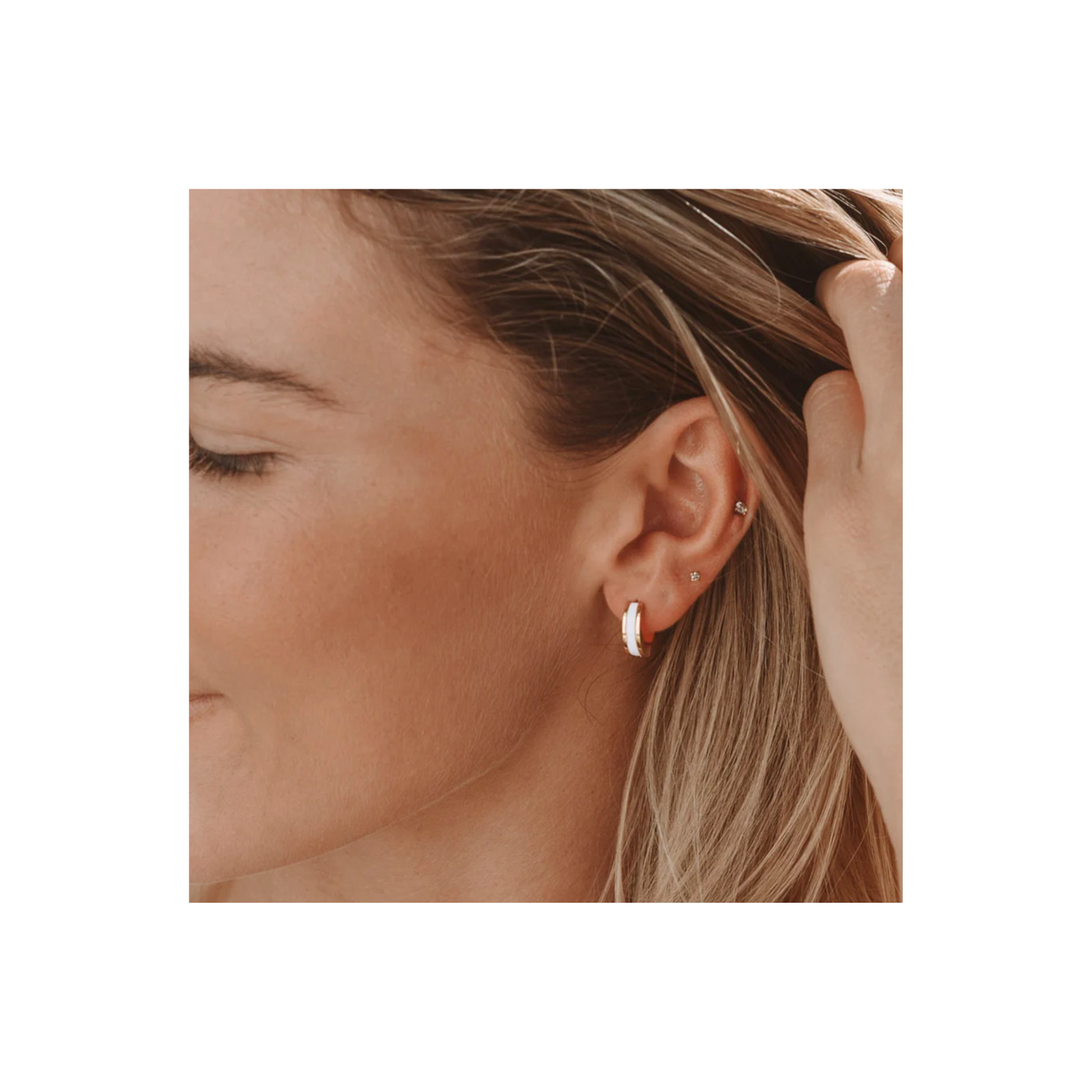 Bright & Breezy: Featuring a smooth white enamel inlay wrapped in luxe 18K gold plating, these huggies are made for sun-filled days and spontaneous nights out.